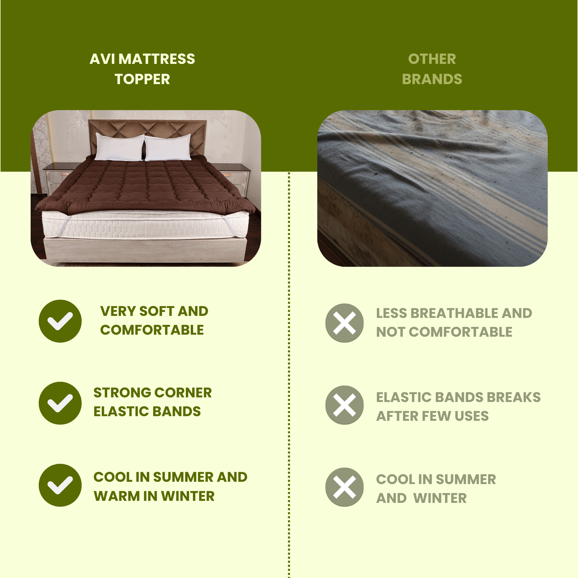 Our Premium Hollow mattress topper makes your mattress top super soft, give new shape and absolutely new life to your old, sagged Mattress. Its is Hypo-Allergenic and anti-dust mite, with elastic band for perfect fit on mattress. It has a cover that can be removed and machine washed.