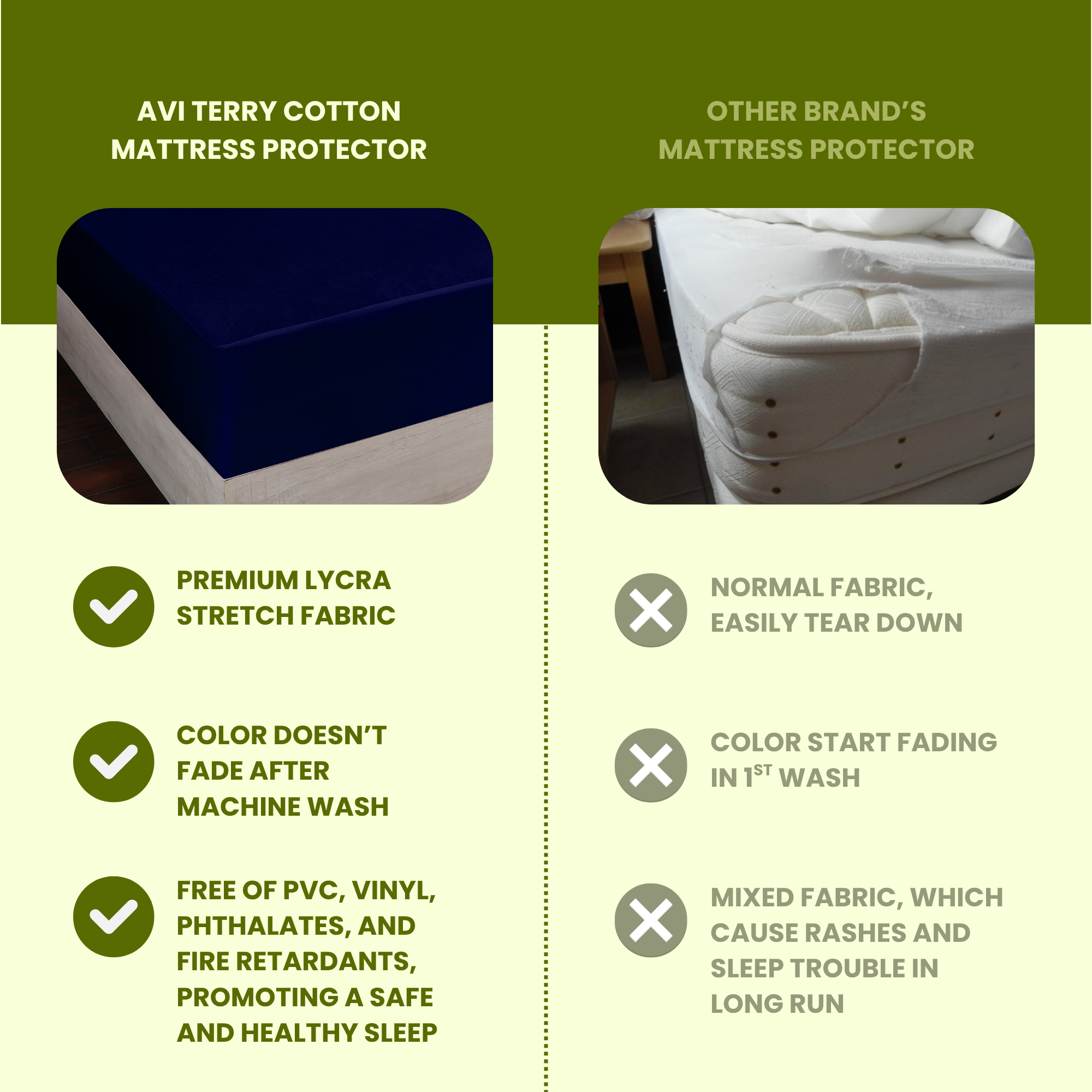 Our luxurious protector also acts like a baby dry sheet and fits perfectly over the mattress. It has a 360° elastic band that allows easy application and can easily fit a mattress of up to 10” thickness.