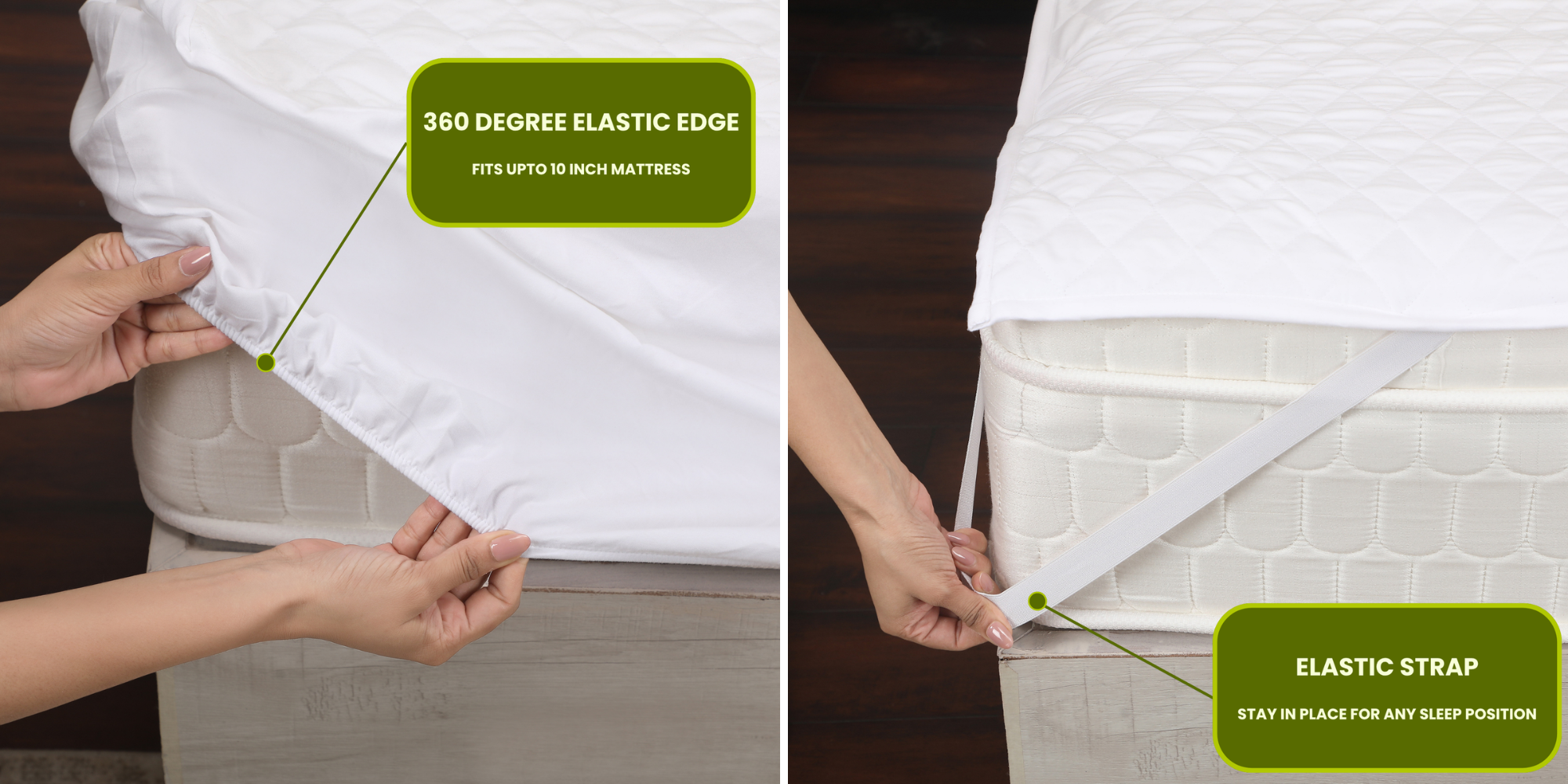 - 360° elastic band that allows easy application and can easily fit a mattress of up to 10” thickness.